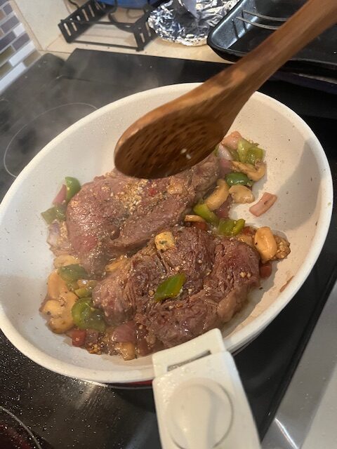 Add ¼ cup of water to help steam-sear the steak and keep it juicy.