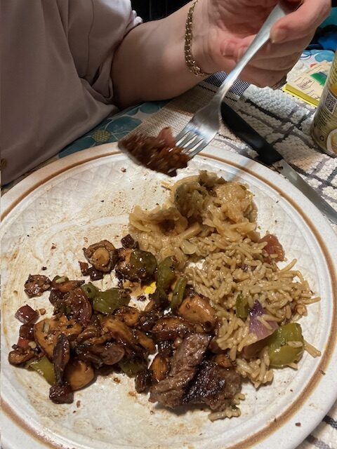 Open your can of seasoned cabbage and warm it on the stove or in the microwave while the rice and veggies are finishing.