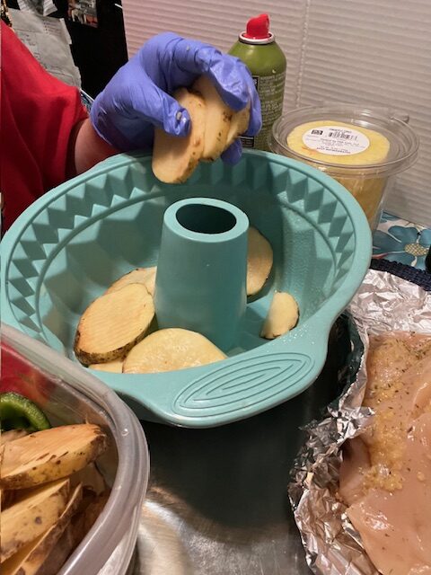 Pour ½ cup chicken stock into the pan to keep everything juicy.