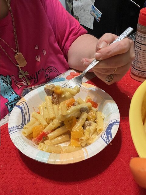 In a large bowl, mix the cooked ziti with the sautéed sausage and veggies.